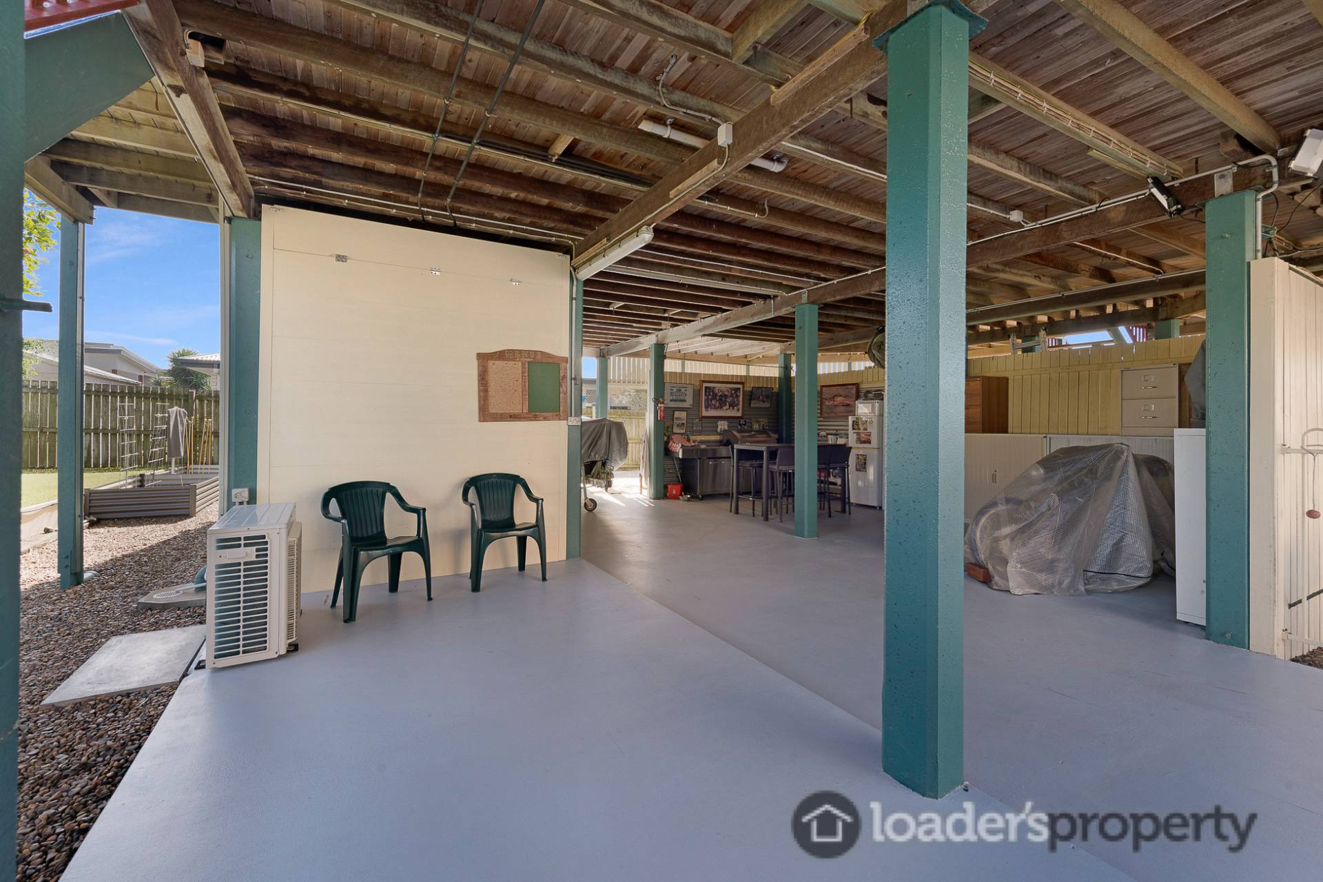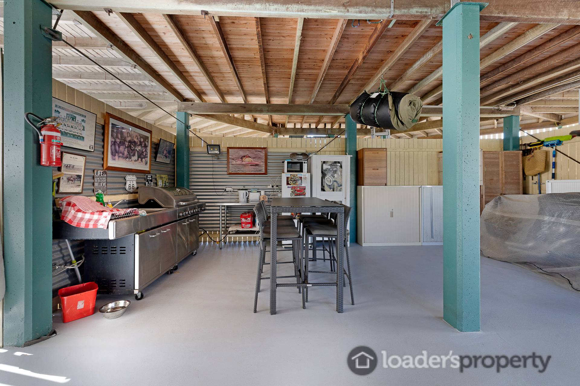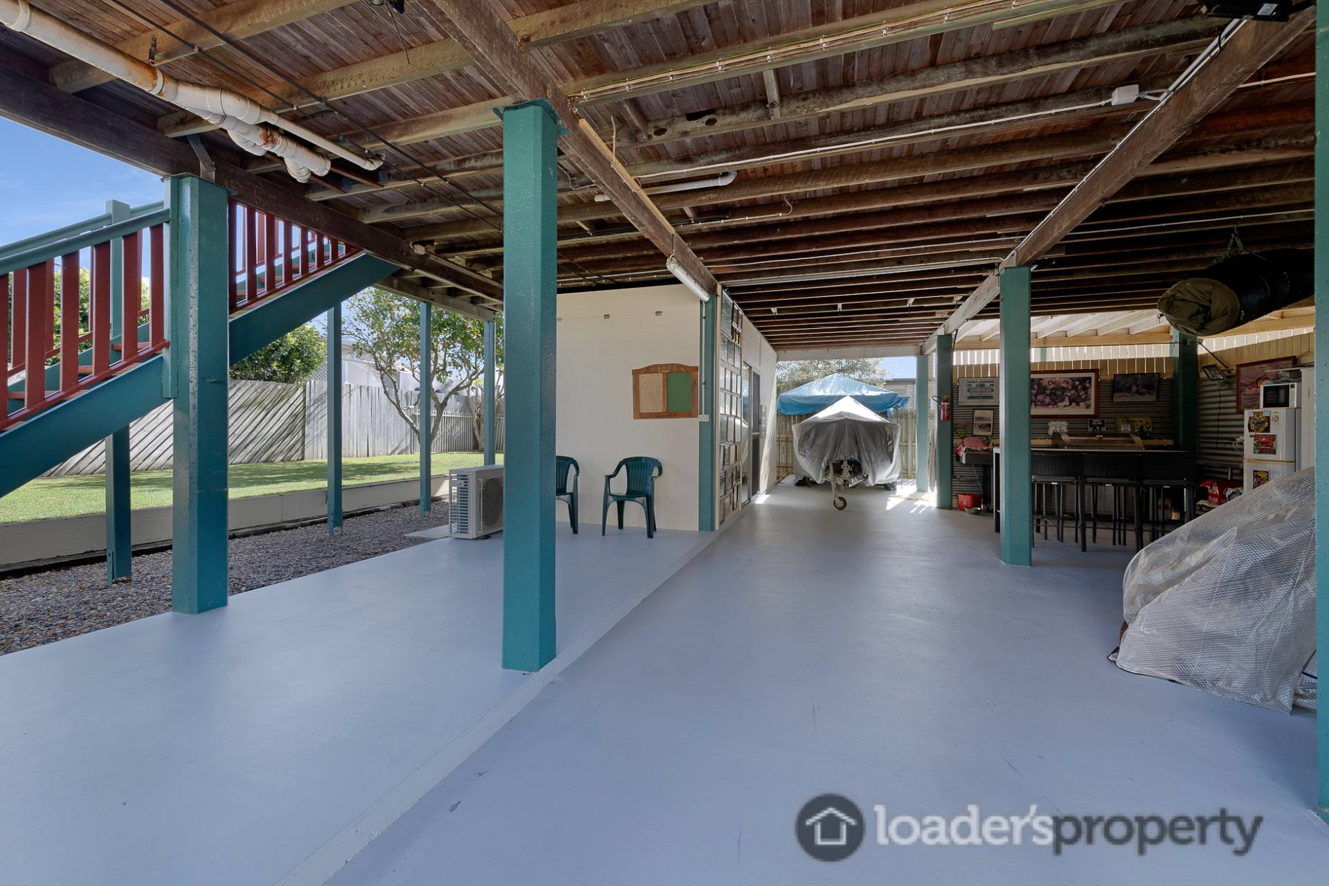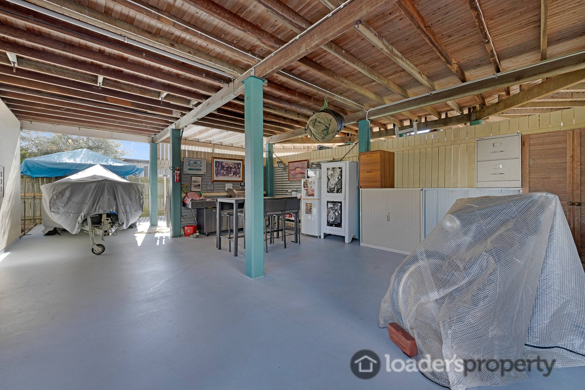 -          Downstairs is absolutely HUGE and fully concreted and sealed. This space offers a multitude of storage options throughout and doubles as the downstairs bar/ entertaining area.